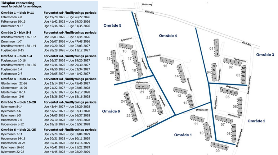 Tidsplanen for ud- og indflytning er blevet opdateret på baggrund af de erfaringer vores entreprenør, Einar Kornerup har gjort sig i forbindelse med renoveringen af prøveblok 10 i Falkemosen.